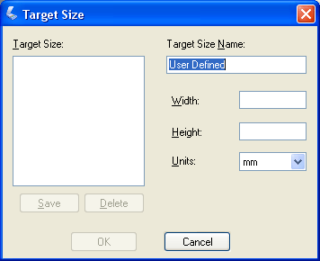 ![]() Anna mukautetulle koolle nimi, määrittele sen koko, napsauta Save (Tallenna) -painiketta ja sen jälkeen OK (OK). Mukautettu koko tulee Target Size (Kohteen koko) -luetteloon.