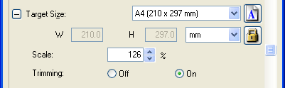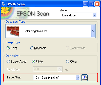 Skannauskoon valintaVoit skannata kuvat alkuperäisessä koossaan, mutta myös pienentää tai suurentaa niitä skannausvaiheessa. Pääset valitsemaan haluamasi koon Target Size (Kohteen koko) -asetuksissa sekä Home (Home-tila)- että Professional Mode (Professional-tila).