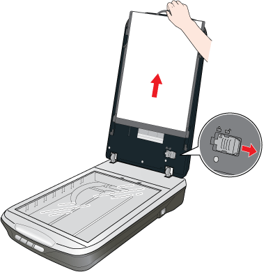 Avaa skannerin kansi ja irrota asiakirja-alusta vetämällä sitä varovasti ylöspäin. Varmista myös, että kalvoyksikön kuljetuslukitus on auki.