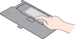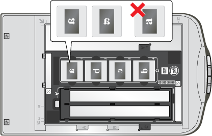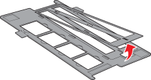 Työnnä yksi kuva kokonaan filmitelineeseen siten, että sen kiiltävä puoli osoittaa alaspäin. Kuvan ja filmillä olevan tekstin tulee näkyä ylöspäin olevalla puolella käänteisesti. Varmista, että kuva on kokonaisuudessaan filmitelineen aukossa.