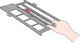 Työnnä yksi tai kaksi filmiliuskaa kokonaan filmitelineeseen niin, että liuskan kiiltävä puoli on alaspäin. Filmillä olevien kuvien ja mahdollisen tekstin tulisi näkyä ylöspäin käänteisesti.