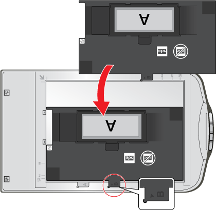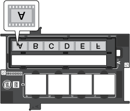 Aseta filmiteline lasitasolle kuvassa esitetyllä tavalla. Varmista, että filmitelineen “A”:lla merkitty kieleke sopii skannerin vastaavaan, “A”:lla merkittyyn kohtaan.