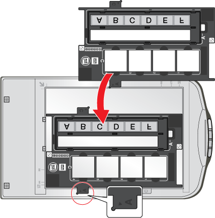 Aseta filmiteline lasitasolle siten, että se on linjassa vasemman ylänurkan kanssa. Varmista, että filmitelineen “B”:llä merkitty kieleke sopii skannerin vastaavaan, “B”:llä merkittyyn kohtaan.