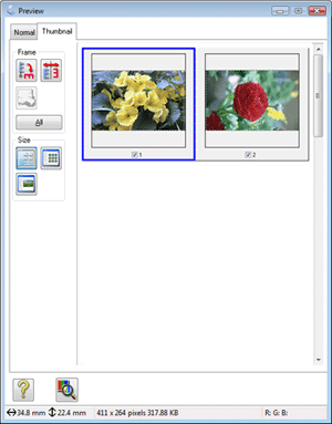 Normal preview (Normaali esikatselu) näyttää esikatselukuvat kokonaisuudessaan. Skannausalueen valinta ja mahdolliset kuvan laatuun liittyvät säädöt on suoritettava käsin.