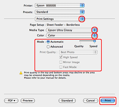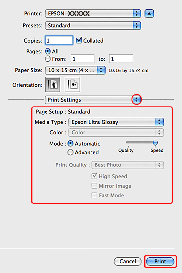 Valitse asianmukainen Media Type (Tulostusmateriaali)-, Color (Väri)- ja Mode (Tila)-asetus. Katso Print Settings (Tulostusasetukset) -lisätietoja käytönaikaisista ohjeista.