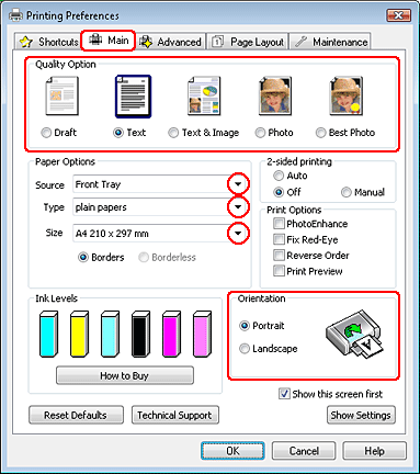 Valitse käyttämäsi tulostin Printer (Tulostin)-asetukseksi ja määritä sen jälkeen sopivat asetukset.