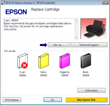 Kun väri on loppu, näyttöön tulee How To (Miten) -painike. EPSON Status Monitor 3 näyttää kasetin vaihtamisen vaihe vaiheelta valitsemalla How To (Miten).