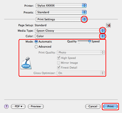 Mac OS X Napsauta sovelluksen File (Tiedosto) -valikossa Print (Tulosta), valitse esiin tulevasta Print (Tulosta) -ikkunasta Print Settings (Tulostusasetukset), valitse sitten Off (Ei käytössä) Gloss Optimizer (Kiillon optimointi) -toiminnon asetukseksi, joka on käytettävissä, kun Print Settings (Tulostusasetukset) -kohdasta valitaan Advanced (Lisätoiminnot).