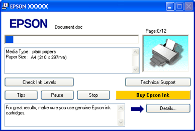 VihjeitäTilanneilmaisinikkunan tekstiruudussa annetaan vihjeitä siitä, miten voit käyttää Epson-tulostimen ohjelmistoa mahdollisimman tehokkaasti. Tekstiruutuun tulee uusi vihje 15 sekunnin välein. Katso näytöllä olevan vihjeen lisätiedot valitsemalla Details (Tiedot).