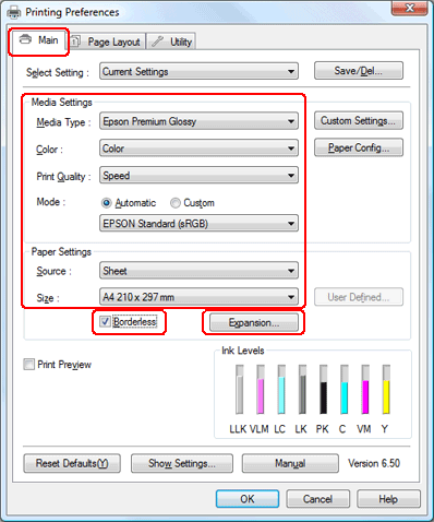 Valitse oikea Paper Size (Paperikoko) -asetus. Jos haluat tulostaa reunuksettomia valokuvia, valitse paperin koko ja reunuksettoman tulostuksen toimintatilaksi Auto Expand (Laajenna autom.) tai Retain Size (Säilytä koko).