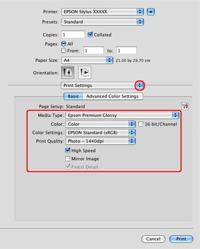 Valitse oikeat Media Type (Tulostusmateriaali)-, Color (Väri)- ja Mode (Tila) -asetukset. Katso lisätiedot käytönaikaisesta Print Settings (Tulostusasetukset) -ohjeesta.