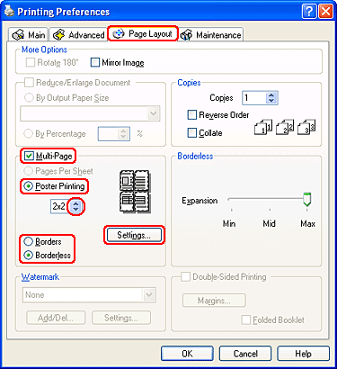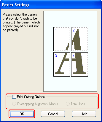 Julisteasetuksella voidaan luoda julistekokoisia kuvia tulostamalla asiakirjan yksi sivu usealle arkille.