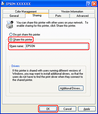 Valitse Share this printer (Jaa tämä tulostin), kirjoita sitten jaettu nimi.