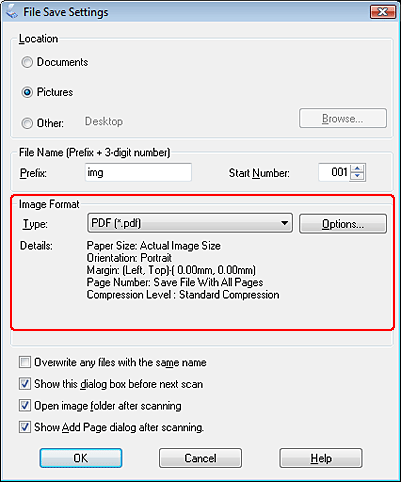 Valitse asiakirjallesi sopivat asetukset ja napsauta OK. Palaat File Save Settings (Tiedoston tallennusasetukset) -ikkunaan.