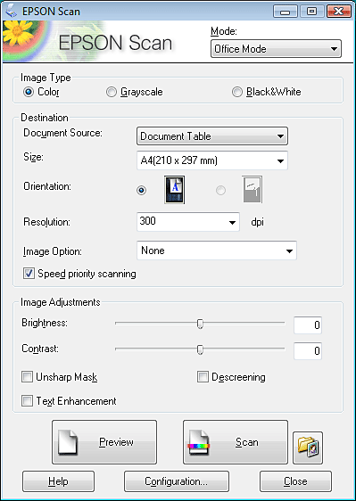 Skannaus Office-tilaKun valitset Office Mode (Office-tila), näkyviin tulee Epson Scanin Office Mode (Office-tila) ikkuna.