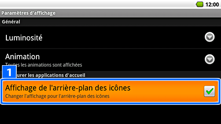 1 Toutes les apps : Affiche toutes les applications installées. 2 Ajouter : Ajoute un raccourci sur l’écran d’accueil. 3 Rechercher : Affiche l’écran de recherche. 4 Notifications : Affiche l’écran de notifications. 5 Paramètres : Affiche le menu de paramètres.