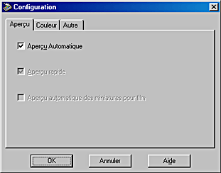 Cliquez sur le bouton Configuration pour ouvrir la boîte de dialogue Configuration dans laquelle vous pouvez régler toute une gamme de paramètres liés à la fenêtre d'aperçu et à l'image en aperçu, et effectuer un réglage des couleurs.