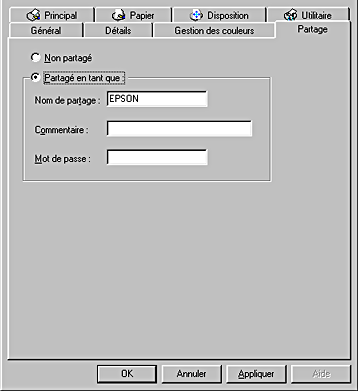 Sélectionnez Partagé en tant que, saisissez les informations nécessaires concernant le combiné multifonction et cliquez sur OK.