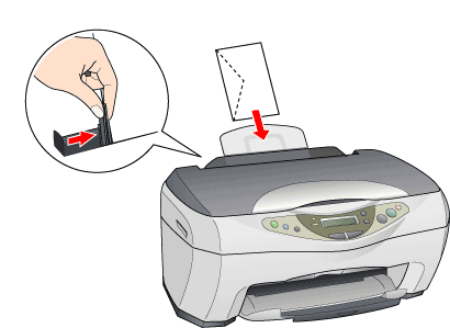 Chargez les enveloppes par le petit côté, rabat vers le bas, comme illustré ci-dessous.
