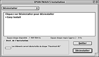 ![]() | Sélectionnez EPSON TWAIN 5 dans la liste, puis cliquez sur Ajouter/supprimer (Windows Me, 98) ou Changer/supprimer (Windows XP ou 2000). |