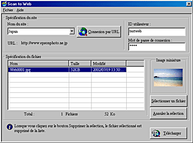 Utilisez cette application pour numériser une image puis la télécharger sur le site de partage de photos EPSON. Lorsque vous lancez cette application, une image est numérisée à partir de EPSON TWAIN et affichée dans la boîte de dialogue Verify Assistant. Cliquez sur Terminer ; la boîte de dialogue ci-dessous s'affiche. Cliquez sur Télécharger pour télécharger l'image. Pour plus de détails, reportez-vous à la documentation d'EPSON Smart Panel.