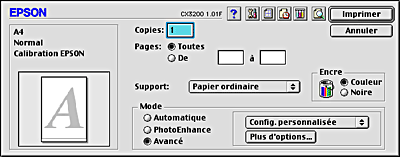Si vous modifiez les réglages Support ou Encre lorsque l'une de vos configurations personnalisées est sélectionnée dans la liste Config. personnalisée, la sélection affichée dans la liste revient à Config. personnalisée. La modification n'a aucune incidence sur la configuration personnalisée précédemment sélectionnée. Pour revenir à votre configuration personnalisée, resélectionnez-la simplement dans la liste.