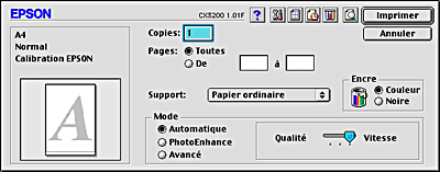 Quand l'option Automatique est sélectionnée dans la zone Mode de la zone de dialogue Imprimer, le logiciel d'impression règle tous les paramètres détaillés en fonction des réglages actuels des paramètres Support et Encre. Pour régler le paramètre Encre, reportez-vous à la section Réglage du paramètre Encre. Pour régler le paramètre Support, reportez-vous à la section Réglage du paramètre Support.