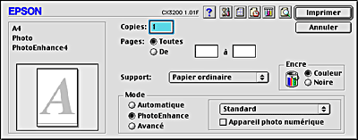 ![]() | Vérifiez que les options choisies pour les paramètres Support et Encre de la zone de dialogue Imprimer sont corrects. Pour plus de détails, reportez-vous aux sections Réglage du paramètre Encre ou Réglage du paramètre Support. |