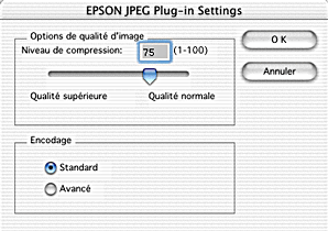 Sélectionnez un format de fichier pour l'enregistrement des images numérisées : PICT, JPEG, TIFF ou Multi-TIFF. Les informations détaillées relatives à chaque format (à l'exception du format PICT) sont affichées dans la section Détails. En fonction du format de fichier sélectionné, vous pouvez accéder au bouton Options qui vous permet d'effectuer des réglages détaillés pour l'enregistrement de l'image numérisée. Reportez-vous aux sections Boîte de dialogue des paramètres détaillés JPEG ou Boîte de dialogue des paramètres détaillés TIFF et Multi-TIFF.