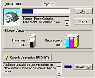 Lorsqu'une impression est lancée, le bouton EPSON Stylus CX3200 apparaît dans la barre des tâches. Cliquez sur ce bouton pour ouvrir l'utilitaire EPSON Spool Manager.