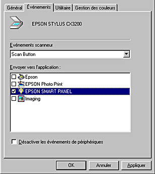 Scan du combiné multifonction n'importe quelle application Windows, autre qu'EPSON Smart Panel, prenant en charge les Événements scanner (par exemple Imaging pour Windows, si cette application est installée). Lorsque vous appuyez sur la touche