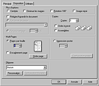 Sélectionnez Disposition dans le menu déroulant comme valeur du réglage Multi-Pages pour imprimer plusieurs pages du document sur une seule feuille de papier.