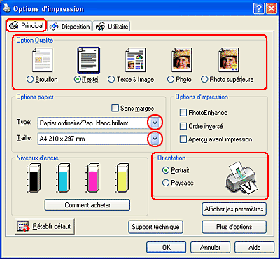 Cliquez sur l'onglet Principal et définissez ensuite les paramètres Option qualité. Pour plus de détails, consultez l'aide en ligne.