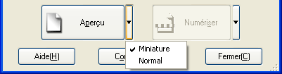 Cliquez sur le bouton Aperçu pour lancer la prénumérisation et afficher un aperçu de l'image. En fonction du mode de numérisation et des paramètres Type de document, une petite flèche apparaît à droite du bouton Aperçu pour vous permettre de sélectionner un mode d'aperçu. Cliquez sur la flèche et sélectionnez Miniature ou Normal pour modifier le mode d'aperçu.