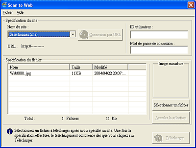 Cette application vous permet de numériser une image avec la technologie PRINT Image Matching et de la télécharger sur le site de partage de photos EPSON. Lorsque vous lancez cette application, l'image est numérisée à partir de EPSON Scan et affichée dans la boîte de dialogue Assistant de vérification. Cliquez sur Suivant, la boîte de dialogue ci-dessous s'affiche. Cliquez sur Télécharger pour télécharger l'image.