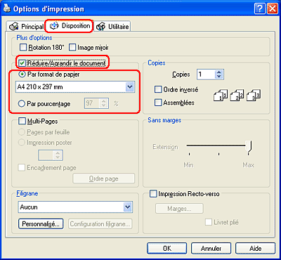 Activez la case à cocher Par format de papier et sélectionnez dans la liste déroulante la taille de papier que vous avez chargé dans le bac feuille à feuille, ou activez la case à cocher Par pourcentage et cliquez sur les flèches pour sélectionner le pourcentage.
