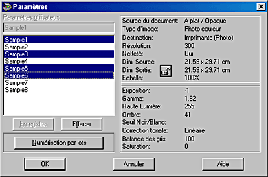 Pour numériser une seule image en utilisant différents paramètres, constituez et enregistrez chaque groupe de paramètres comme indiqué plus haut. Ensuite, dans la liste Paramètres utilisateur, cliquez sur la configuration personnalisée que vous voulez enregistrer tout en maintenant la touche Ctrl enfoncée. Après avoir sélectionné la configuration de numérisation que vous voulez utiliser, cliquez sur Numérisation par lots. Le combiné multifonction numérise une fois l'image pour chacun des groupes de paramètres que vous avez sélectionnés.