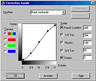 La fonction Correction tonale fournit des courbes de correction tonale prédéfinies permettant d'ajuster le contraste dans une image. Utilisée en conjonction avec les paramètres de la boîte de dialogue Contrôle des images, cette fonction étend vos possibilités en matière de contrôle de l'image.