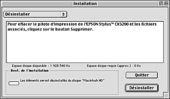 ![]() | Mettez le Macintosh sous tension et insérez le CD-ROM du logiciel dans le lecteur. Le logiciel d'impression EPSON se lance automatiquement. |