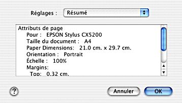 Affichage des réglages en cours de la zone de dialogue Format d'impression