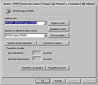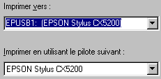 Si la mention EPUSBX : (EPSON Stylus CX5200) apparaît dans la zone de liste Imprimer vers, le pilote d'impression USB et le logiciel d'impression sont correctement installés. Si le port adéquat n'est pas affiché, passez à l'étape suivante.
