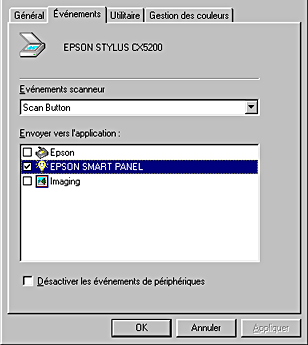 Scan du combiné multifonction n'importe quelle application Windows, autre qu'EPSON Smart Panel, prenant en charge les Événements scanner (par exemple Imaging pour Windows, si cette application est installée). Lorsque vous appuyez sur la touche