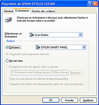 Sélectionnez le combiné multifonction dans la liste des scanners et appareils photo installés. Cliquez sur Propriétés, puis sélectionnez l'onglet Événements.