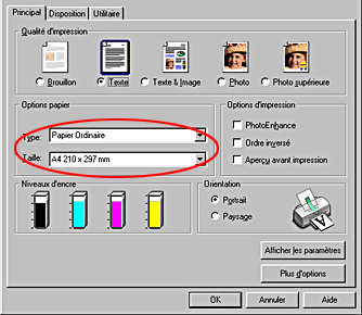 ![]() | Sous Windows, sélectionnez la Taille et le Type de papier appropriés dans la zone Options papier du menu Principal. Choisissez ensuite Portrait (vertical) ou Paysage (horizontal) pour modifier l'orientation de l'impression. |