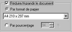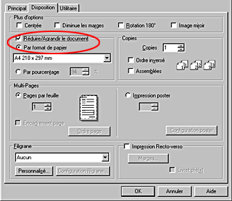 Sous Windows, cochez la case Réduire/Agrandir le document et sélectionnez l'option Par format de papier dans le menu Disposition.