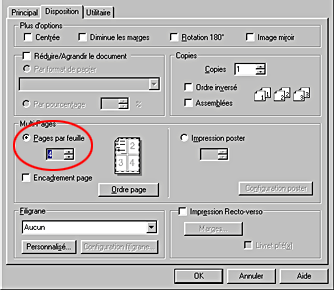 L'option d'impression Pages par feuille (Windows) ou N-Pages (Macintosh) permet d'imprimer deux ou quatre pages sur une seule feuille.