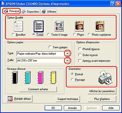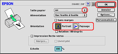 Réglez le paramètre Pour. Pour imprimer avec des marges standard, sélectionnez Stylus CX6400.
