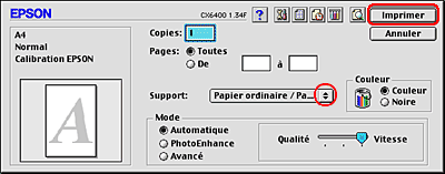 Réglez les paramètres Support, Encre et Mode. Pour plus de détails, consultez l'aide en ligne