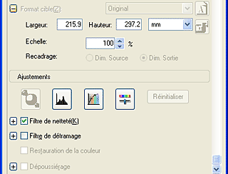 ![]() | Spécifiez la taille de sortie de l'image numérisée à l'aide du paramètre Format cible et effectuez, au besoin, des réglages avec les outils d'ajustement de la qualité de l'image. |