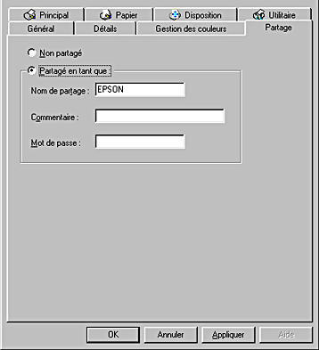 Cliquez sur le bouton Configuration. La boîte de dialogue Partage d'imprimante s'affiche.